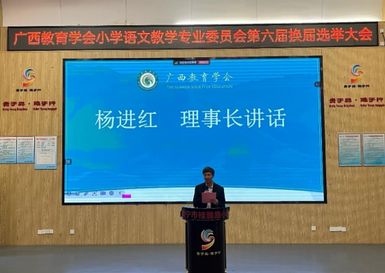 广西教育学会副秘书长李艳萍宣读了关于同意小学语文教学专业委员会换届大会工作请示的批复文件,之后,副理事长陆云对上一届理事会任期工作做了总结汇报,他回顾了第五届专委会在过去所取得的系列成就,总结了专委会在教学改革、学术交流、教研实践等方面积淀的经验,并对新一届理事会寄予期望。